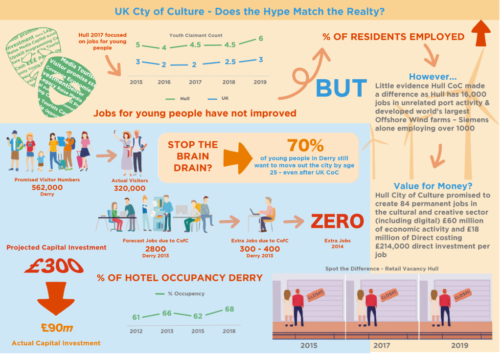 Infographics can be used to explain an object, idea or process using clear illustrations in a way that unlocks the information being provided to give insights and clarity or present data in an interesting format that paints a narrative (Lankow, 2012) The attached infographic aims to present a critical analysis of some of the secondary data sources which represent the recorded impact of UKCoC and which challenge some of the existing narrative from organisers (Arts Council England, 2012) who almost consistently represent UKCoC as a driver for economic growth and job creation. As such, rather than provide an holistic view of the impact of UKCoC, data sets chosen were those which emphasised the quantifiable impacts, especially, although not exclusively from an economic impact. The infographic exposes dichotomies between the hype and the reality of the impact of UkCoC and invites further analysis of the value proposition of UK CoC and whether it is ‘life and place changing’ or a ‘12 month party’? (Boland, et al., 2016), it further invites research into the opportunity cost of staging events such as UKCoC as, if the wished for outcomes are – for example – a new cultural venue, more hotels, inward investment and more jobs, the question could be asked as to whether resource should be applied to achieving the outcomes directly rather than indirectly through a proposed and seemingly unproven “economic osmosis”. Indeed the major success in Hull in creating jobs seems unrelated to the CoC initiative but relate to port and wind farm activity (Hull City Council a, 2020) (Hull City Council b, 2020) These questions become more pertinent as cities around the UK and the wider world face difficult decisions about the future shape of their place as the ongoing decline of traditional retail and the effects of Covid 19 impact the vitality of city centres and traditional uses. The homogenisation effects of assigning resource to, what appear to be, top down imported CoC “roadshows” could in fact act as a dampener on the creation of home grown local talent and the diminishing of indigenous, authentic and potential Foucauldian heterotopic assets within a city, that offer the promise of a more sustainable conduit to coherent communities, wealth and job creation. (Ntounis & Kanellopoulou, 2017)